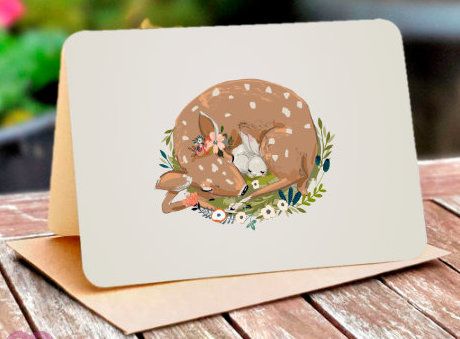 Rehkitz und Häschen liegen auf einer Blumenwiese.