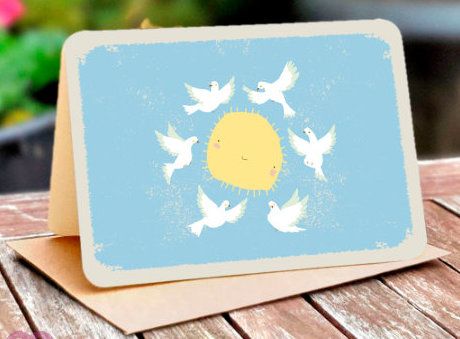 Sechs Friedenstauben fliegen um die Sonne herum.