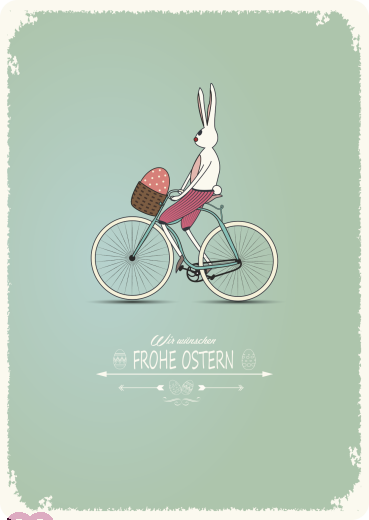 Osterkarte - Osterhase fährt Fahrrad. Im Fahrradkorb befördert er ein buntes Ei. Text: "Wir wünschen frohe Ostern!".