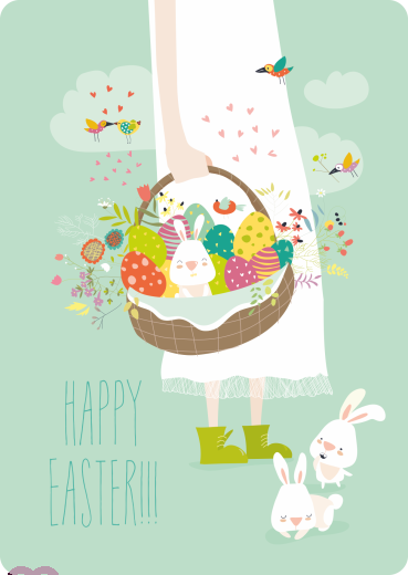 Mädchen mit einem Korb Ostereiern und Osterhasen.