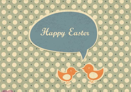 Frohe Ostern! Illustration mit Sprechblase mit "Happy Easter!" und Küken mit blauem Hintergrund und weißen Punkten.