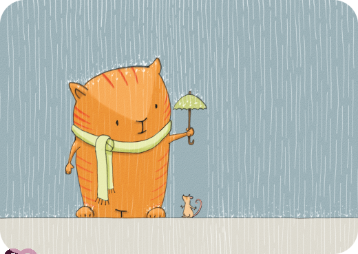 Eine Katze hält einer Maus einen Regenschirm hin, Illustration von Imke Sönnichsen.