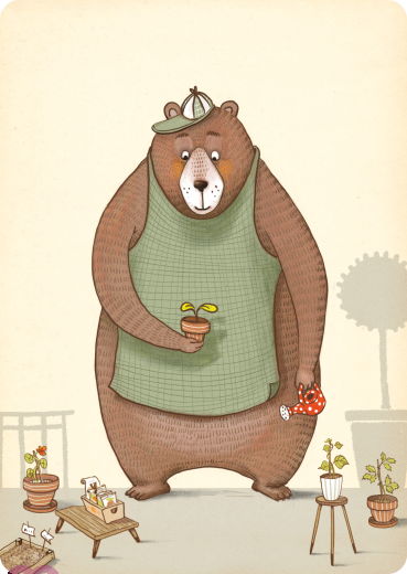 Bär beim gärtnern mit Gießkanne, und Pflanzen in kleinen Töpfen. Illustration von Imke Sönnichsen.