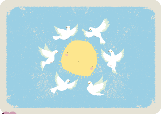 Sechs Friedenstauben umkreisen die Sonne - Naturpapier Postkarte abgerundeten Ecken Querformat DIN A6auf hochwertigem recyceltem Naturpapier gedruckt