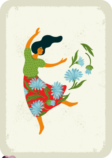 Frau mit Blumenkleid tanzt so wild, dass die Blumen umherfliegen