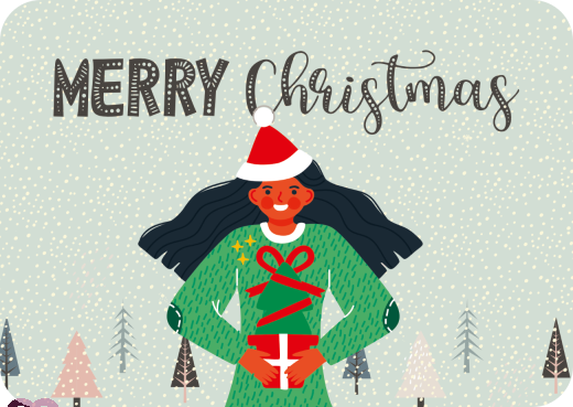Merry Christmas – Frau mit Weihnachtsmütze hält einen kleinen Tannenbaum