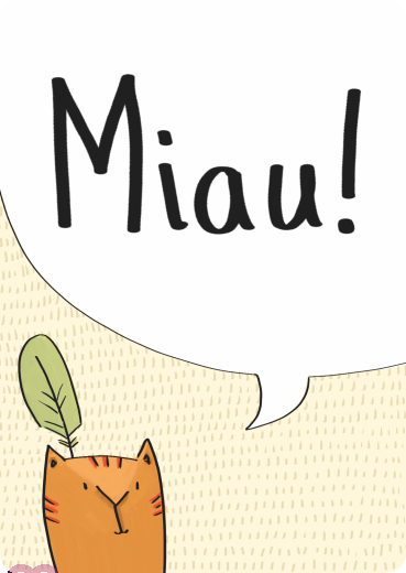 Miau! Katze mit Indianerfeder miaut. Das Miau kann für alles Mögliche stehen (z.B. Ich liebe Dich - Happy Birthday - Melde Dich mal - Viel Spass - Danke - Gute Besserung - Entschuldigung - Herzlichen Glückwunsch zum Geburtstag und vieles mehr). Illustration von Imke Sönnichsen.