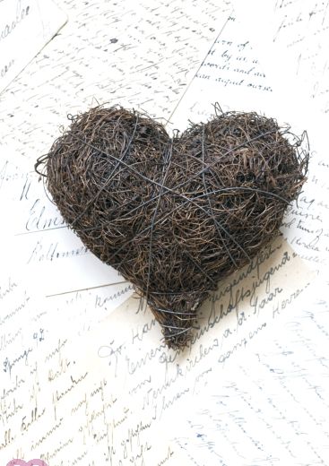 Kunstvoll gebundenes Herz aus feinen Zweigen auf Liebesbriefen liegend.
