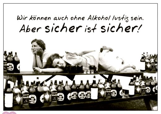 Zwei Freundinnen liegen auf einem Picknick-Tisch, umringt von Flaschen mit Alkohol. Spruch: "Wir können auch ohne Alkohol lustig sein. Aber sicher ist sicher!"