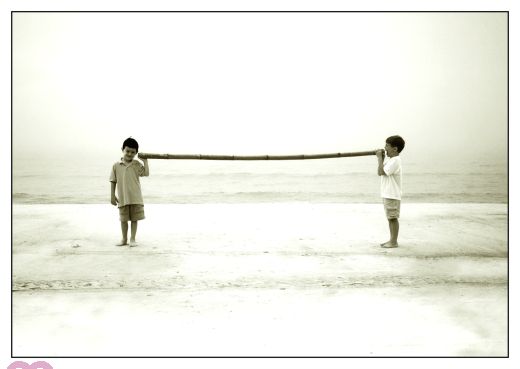 Rohrpost. Zwei Jungen sprechen am Strand durch eine Bambusstange.