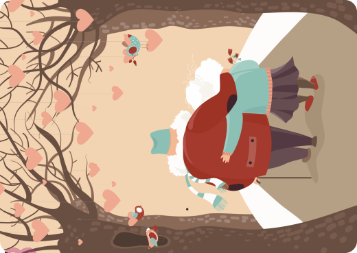 Älteres Liebespaar auf einem Waldweg umringt von mit Herzen geschmückten Bäumen.
