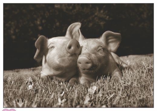 Zwei junge Ferkel liegen entspannt auf einer Wiese.