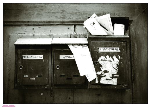 Ein vor Liebesbriefen überquellender Briefkasten neben Briefkästen für Werbung und Rechnungen