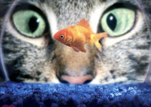 Tiere, Katzen, Kätzchen, Fische, Aquarium, fressen, Goldfische, "Cat and Goldfish", Farbe, quer