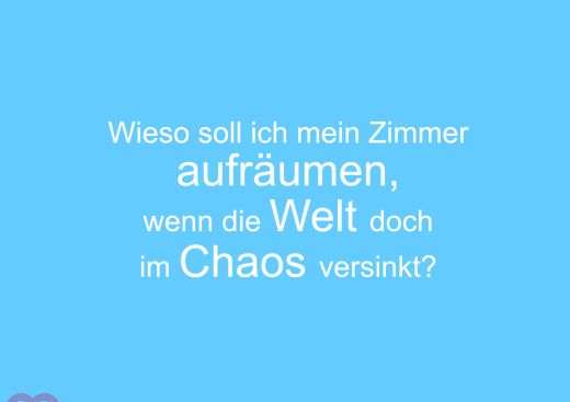 Spruchkarte: "Wieso soll ich mein Zimmer aufräumen, wenn die Welt doch im Chaos versinkt?"