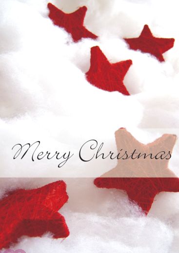 Rote Weihnachtssterne liegen verteilt im Schnee mit dem Spruch "Merry Christmas".