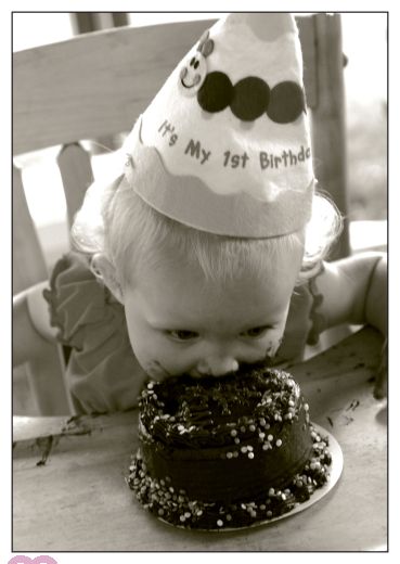 Ein kleines Kind / Junge beißt in eine Geburtstagstorte aus Schokolade. Der Mund ist bereits Schokoladenverschmiert.