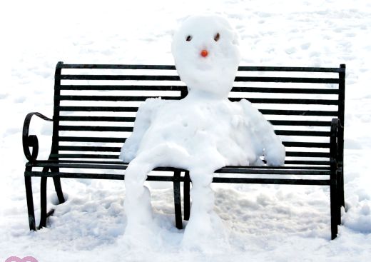Schmelzender Schneemann sitzt auf einer Parkbank.