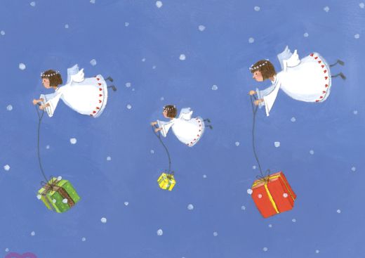 Drei fliegende Engel tragen Weihnachtsgeschenke. Illustriert von Imke Sönnichsen.