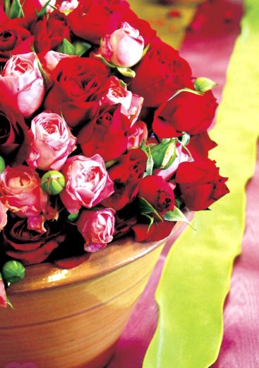 Blumenkübel mit roten und rosa Rosen.