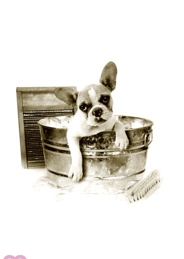 Waschtag! Dieser Hund trägt den schlimmsten Tag für einen Hund mit Fassung.