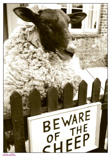 Dominantes Schaf am Gartentor mit dem Schild "Beware of the Sheep".
