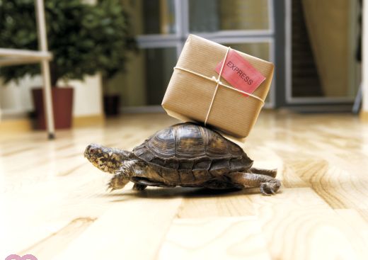 Express Paket von einer Schildkröte auf dem Panzer transportiert.
