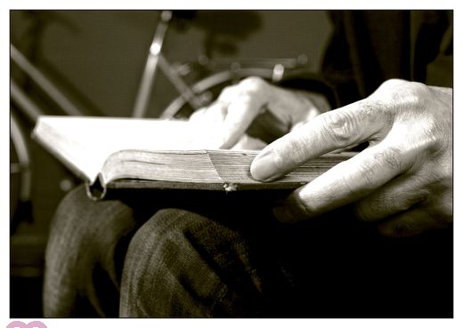 Alter Mann oder alte Frau sitzt mit einem Buch auf dem Schoß und ließt.