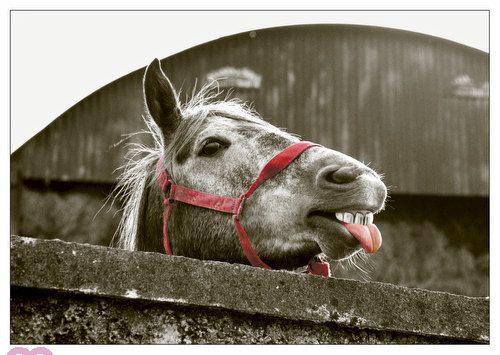 Schadenfrohes Pferd guckt über eine Mauer und streckt seine rote Zunge heraus.