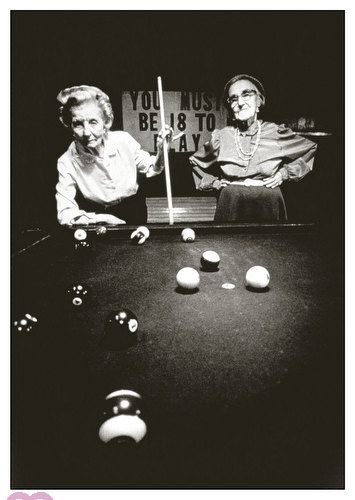 Zwei alte Omas spielen Billard. Im Hintergrund hängt ein Schild mit der Aufschrift: "You must be 18 to play".