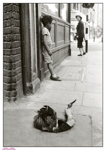 Kleiner Indianerjunge guckt aus einem Gulli und zielt mit einer Pistole auf eine Frau.