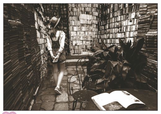 Eine junge Frau mit Hut stöbert in einem open-air Buchladen.