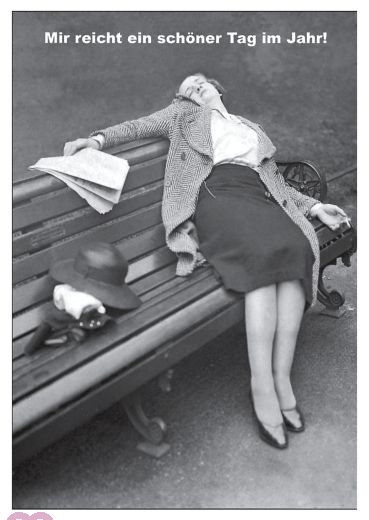 Frau liegt entspannt auf einer Parkbank mit dem Spruch, " Mir reicht ein schöner Tag im Jahr! "
