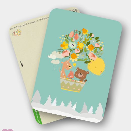 Reh, Fuchs und Bär in einem Heißluftballon aus Blumen.