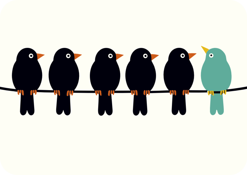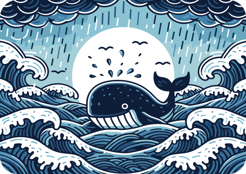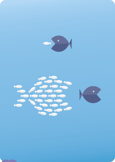 Ein großer Fisch jagt hinter einem kleinen Fisch hinterher. Darunter haben viele kleine Fische ein Team gebildet und jagen zusammen einen großen Fisch.