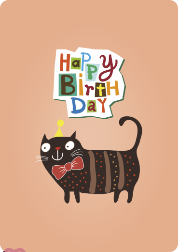 Eine Katze mit Partyhut und Fliege wünscht Happy Birthday.