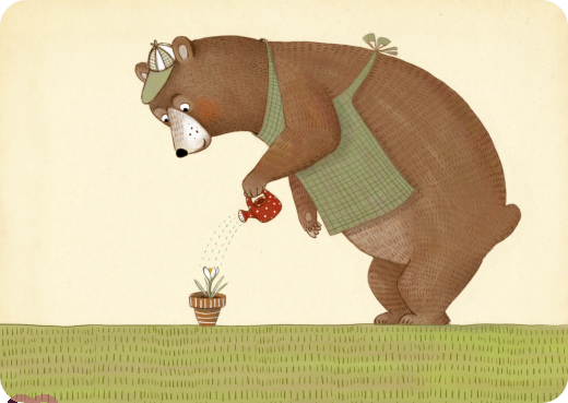 Ein glücklicher Bär, als Gärtner gekleidet, gießt einen Blumentopf mit Krokusse. Illustration von Imke Sönnichsen.