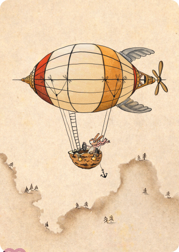 Ein Hase navigiert in einem alten Zeppelin über eine Berglandschaft. Illustration von Imke Sönnichsen.