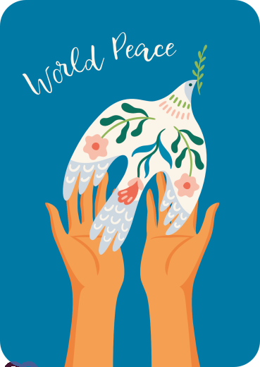 Friedenstaube fliegt in die Luft mit dem Spruch "World Peace".