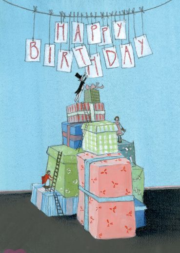 Illustration von Imke Sönnichsen zum Geburtstag. Ein Mann und zwei Frauen besteigen einen übergroßen Geschenkeberg mit Leitern. Der Mann im Frack und Zylinder hängt die Buchstaben für "Happy Birthday" an eine Leine.