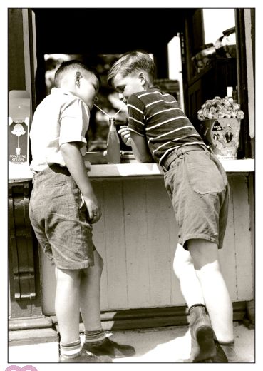 Zwei Freunde stehen am Kiosk und trinken zusammen aus einer Limonade.