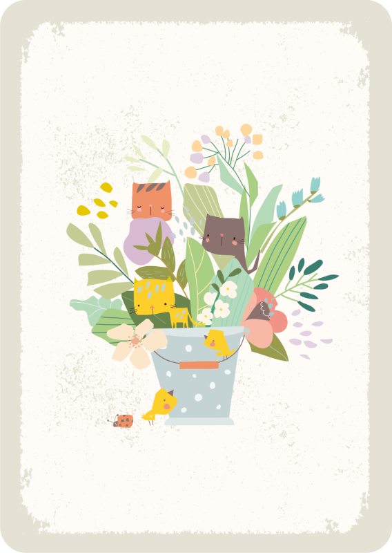Katzen, Vögel und ein Marienkäfer in einem Blumenkübel mit Blumen