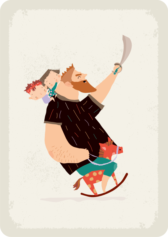 Vater schaukelt mit zwei Kindern auf der Schulter auf einem Schaukelpferd