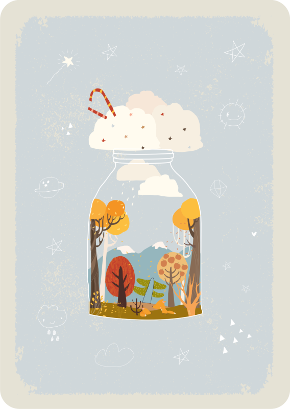 Biosphäre mit Bäumen, Bergen, Wolken und Füchsen in einem Glas