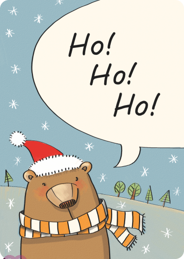 Ho Ho Ho! Bär mit Weihnachtsmütze und Schal im Schnee. Illustration von Imke Sönnichsen.