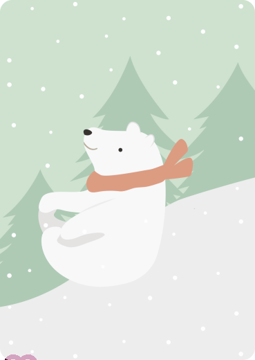 Ein Eisbär mit rotem Schal rutscht auf dem Po einen Hügel hinunter.