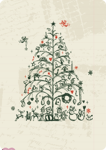 Fröhliche Weihnachten! Zwei Engel fliegen um einen Weihnachtsbaum. Skizzierter stark geschmückter Weihnachtsbaum auf einer Notizbuchseite.