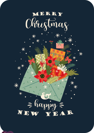 "Merry Christmas - Happy New Year" - Briefumschlag mit Blumen, Weihnachtszweigen und Geschenken - Frohe Weihnachten - Frohes Neues Jahr