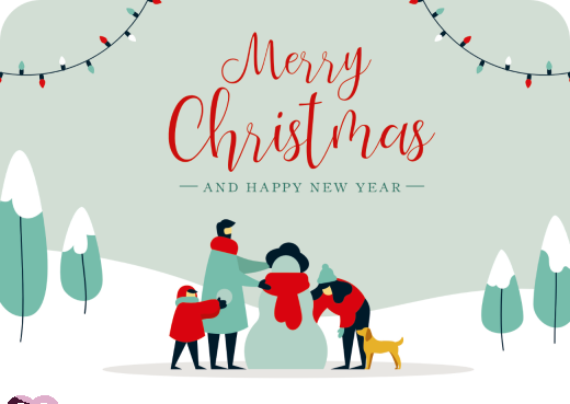 Merry Christmas – Familie mit Hund baut einen Schneemann