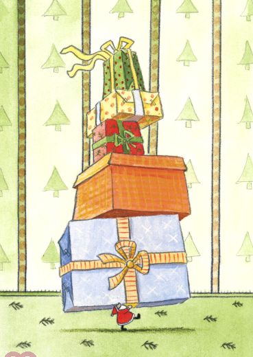 Winziger Weihnachtsmann trägt fünf aufeinander gestapelte Weihnachtsgeschenke. Illustration von Imke Sönnichsen.